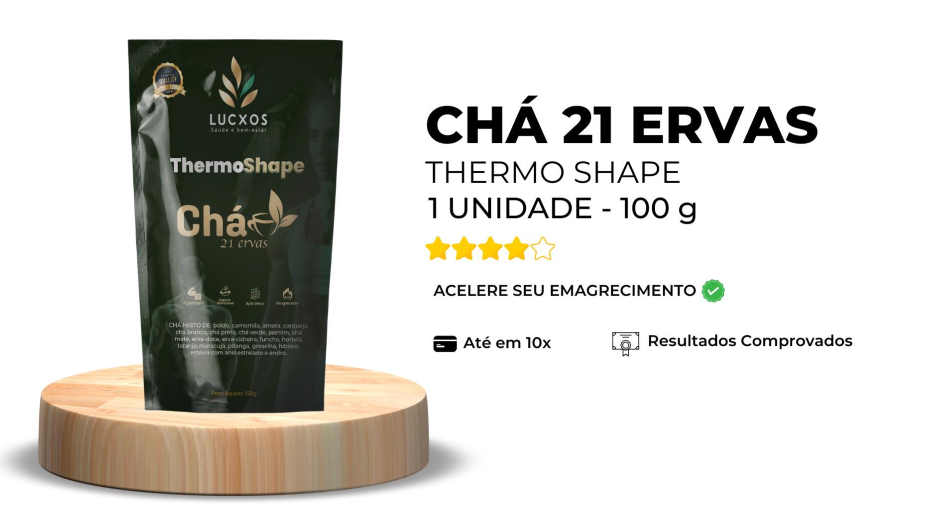 Lucxos Thermo Shape Chá 21 Ervas Desintoxicação, leveza e queima de gordura em cada gole. O Thermo Shape Chá 21 Ervas é um blend natural e poderoso, formulado com ingredientes selecionados para acelerar o metabolismo, eliminar toxinas e estimular o emagrecimento saudável. Sua composição combina 21 ervas medicinais que atuam em sinergia para promover: Benefícios comprovados: Ação termogênica natural ? ativa a queima de gordura Efeito diurético ? reduz inchaço e retenção de líquidos Desintoxicação completa do organismo Sensação de leveza e bem-estar Produto 100% natural, regularizado pela Anvisa Livre de conservantes e adoçantes artificiais