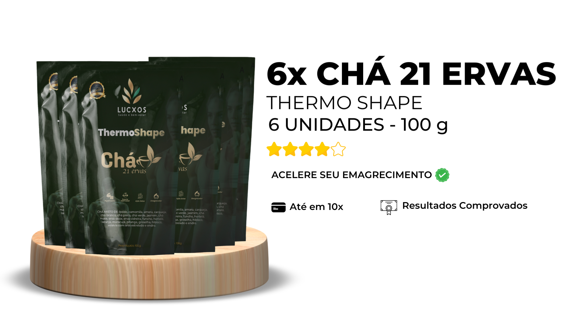 Lucxos Thermo Shape Chá 21 Ervas Desintoxicação, leveza e queima de gordura em cada gole. O Thermo Shape Chá 21 Ervas é um blend natural e poderoso, formulado com ingredientes selecionados para acelerar o metabolismo, eliminar toxinas e estimular o emagrecimento saudável. Sua composição combina 21 ervas medicinais que atuam em sinergia para promover: Benefícios comprovados: Ação termogênica natural ? ativa a queima de gordura Efeito diurético ? reduz inchaço e retenção de líquidos Desintoxicação completa do organismo Sensação de leveza e bem-estar Produto 100% natural, regularizado pela Anvisa Livre de conservantes e adoçantes artificiais