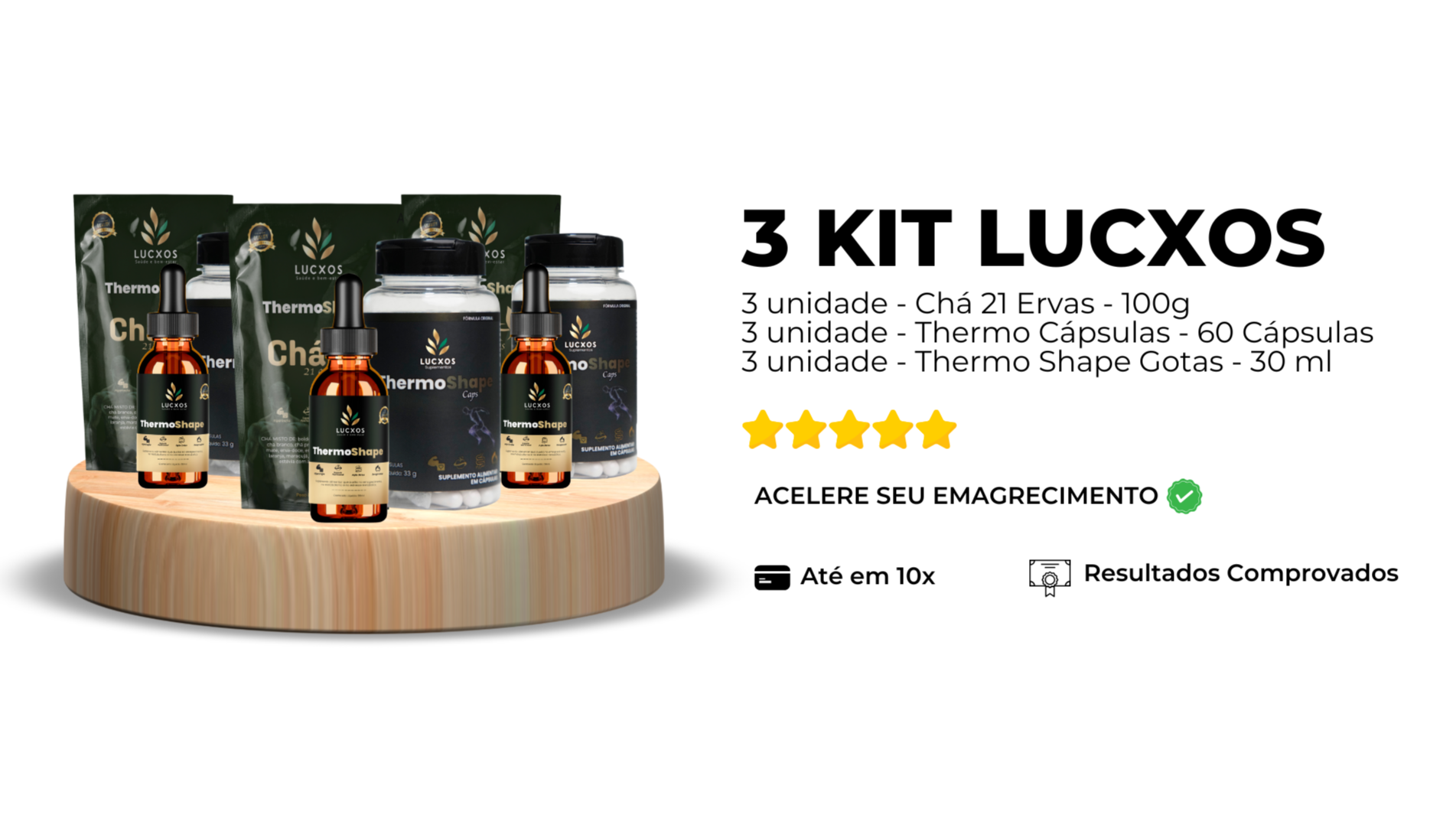 Lucxos Emagrecimento Natural - Contém 3 Produtos: Thermo Fit Cápsulas: Acelera seu metabolismo e potencializa a queima de gorduras, trazendo mais disposição para o seu dia a dia. Lucxos Gota (30 ml): Auxilia no controle do apetite e proporciona uma sensação de bem-estar, ajudando a manter o equilíbrio durante o processo de emagrecimento. Chá de Ervas (100 g): Uma infusão especial que promove a desintoxicação e melhora o funcionamento do seu organismo, de dentro para fora.